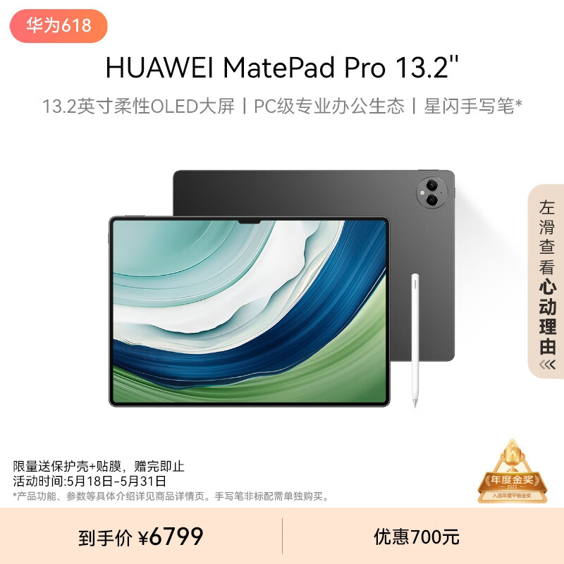 HUAWEI MatePad Pro 13.2英寸 华为平板电脑144Hz OLED柔性护眼屏星闪连接办公创作16+1TB WiFi 曜金黑价格:6799.00元!