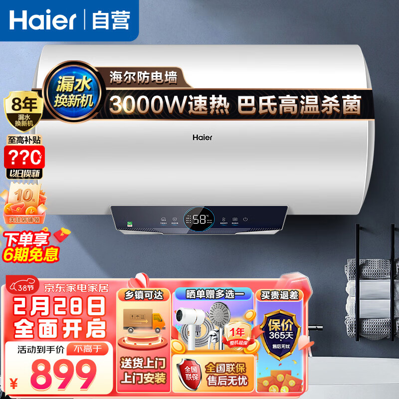 海尔(Haier)50升电热水器3000W速热WIFI智能物联家用热水器节能保温储水式防电墙技术价格:899.00元!