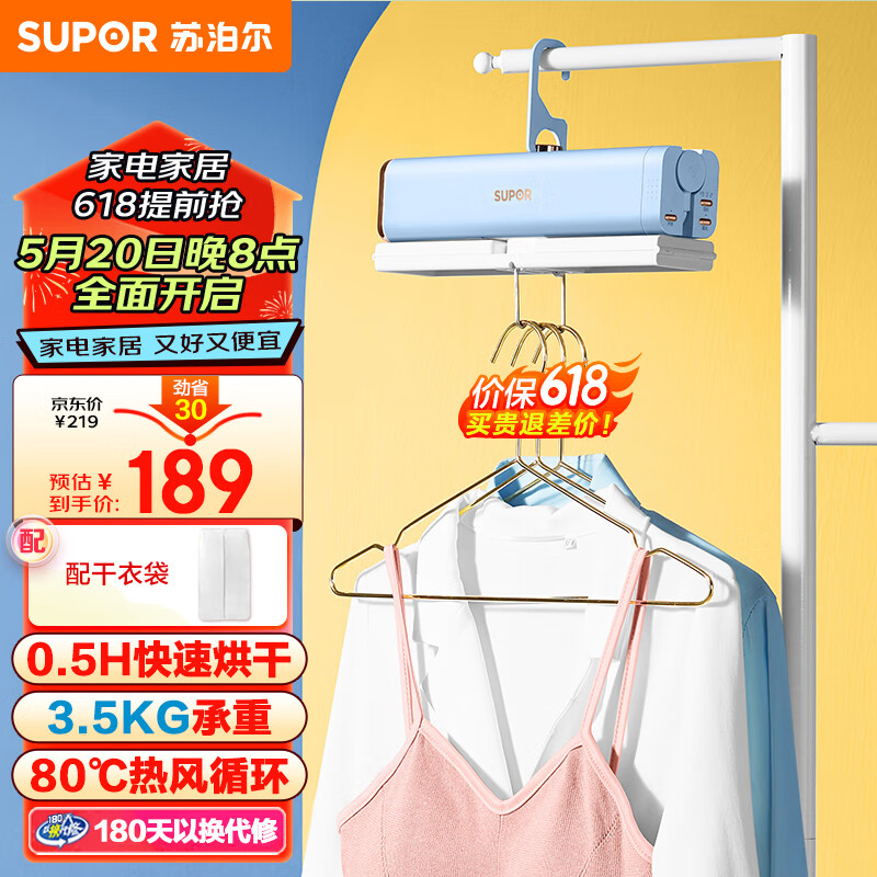 苏泊尔(SUPOR )便携干衣机小型烘衣机家用差旅宿舍干衣神器 快速干衣便携可折叠HG61BX-05浅蓝色价格:189.00元!