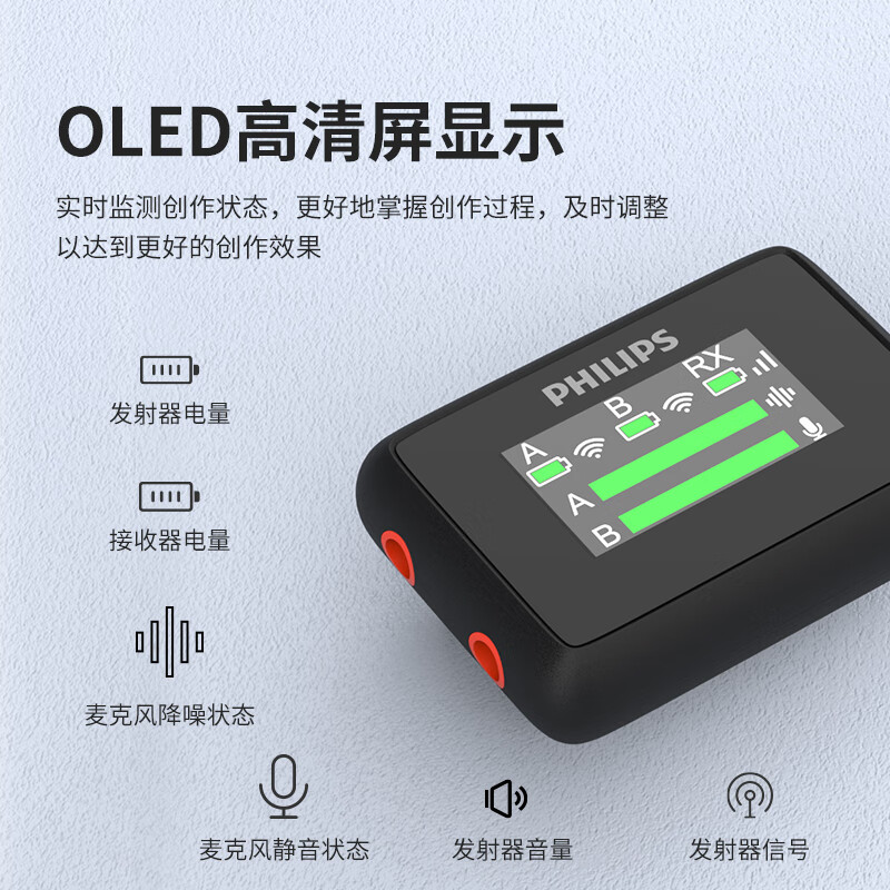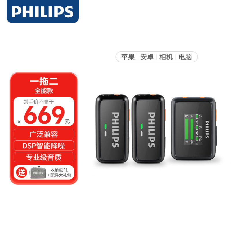 飞利浦(PHILIPS)领夹麦克风一拖二无线收音器 直播vlog短视频户外录音 小蜜蜂手机声卡相机电脑收音麦 DLM3543C价格:669.00元!