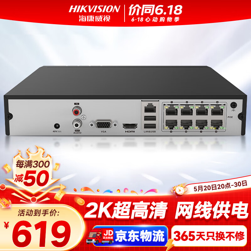 HIKVISION海康威视网络监控硬盘录像机8路高清主机手机远程高性能监控主机DS-7808N-K1/8P价格:719.00元!