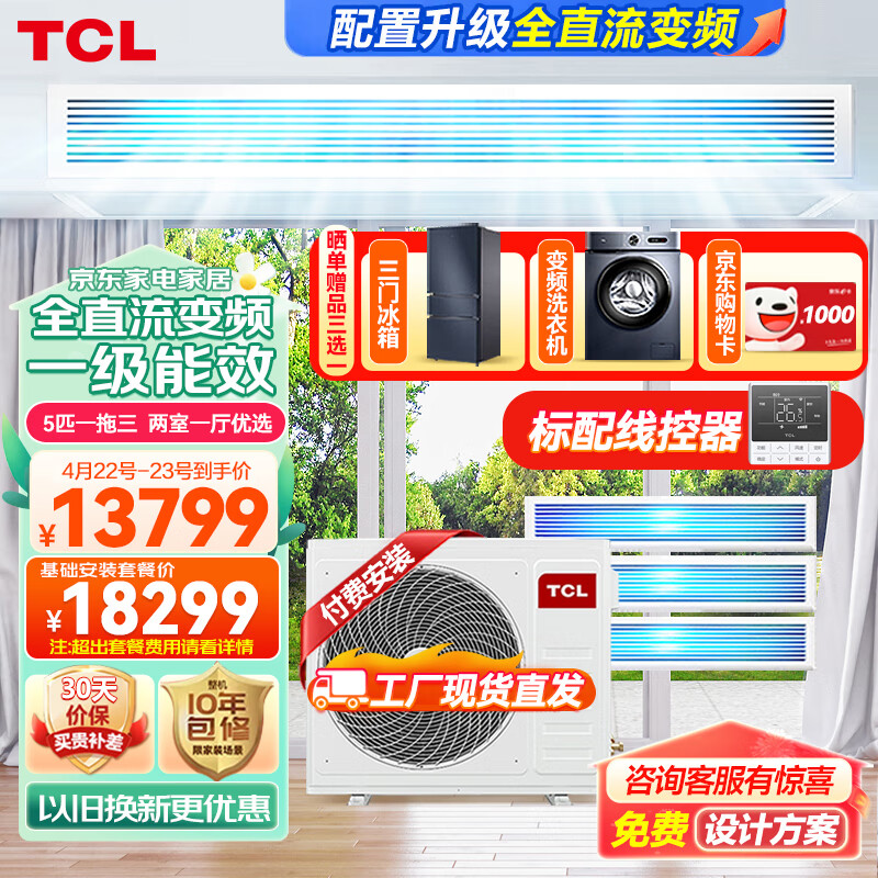 TCL中央空调5匹一拖三 家用全直流变频多联机风管机新一级能效嵌入式空调 两室一厅 TMV-Vd120W/N1-D价格:14799.00元!