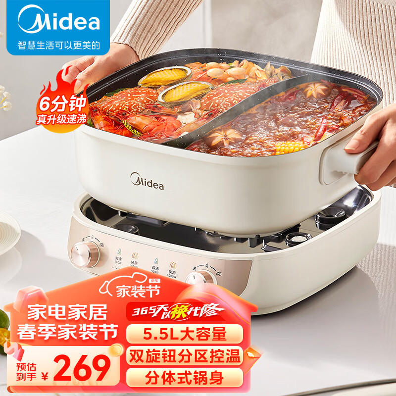 美的(Midea)火锅专用锅 电火锅鸳鸯锅电煮锅 5分45秒速沸5.5L 家用分体多功能锅火锅锅分区独立控温HGS282813价格:269.00元!