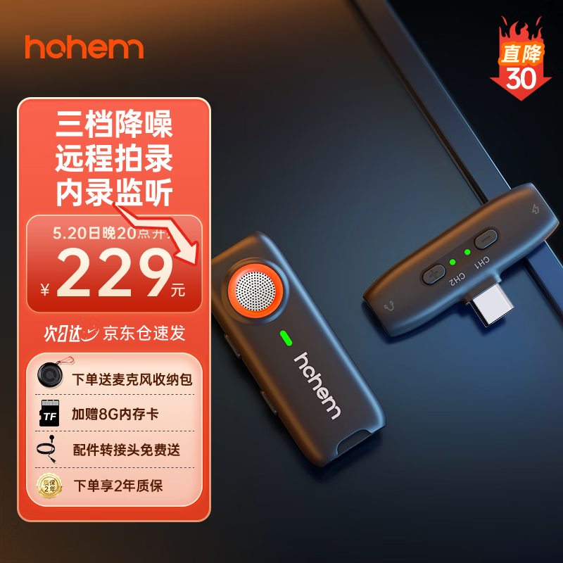 浩瀚(hohem) Mic-01无线领夹麦克风直播话筒收音麦讲解器手机K歌设备主播短视频单反录音安卓黑色一拖一type-c价格:229.00元!
