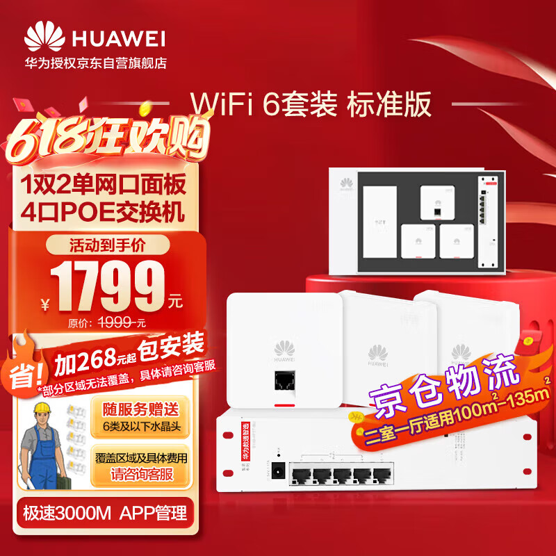 华为全屋wifi6套装标准版3个双频千兆86无线ap面板+4口POE交换机5g分布式路由器企业级家用组网覆盖价格:1799.00元!