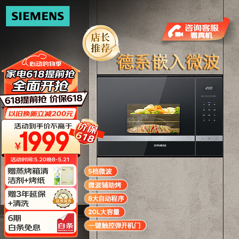 西门子(SIEMENS)微波炉嵌入式8种自动烹饪程序?20升 节能低耗 易清洁BE525LMS0W?西门子蒸烤系列产品 高38.2CM价格:1999.00元!