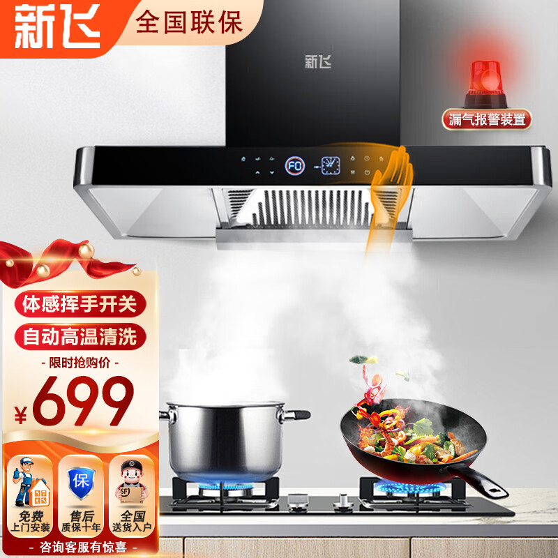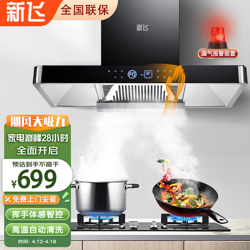 新飞顶吸式吸油烟机家用厨房一级能效八键体感热清洗气检大吸力900宽欧式抽油烟机CXW-280-B6价格:699.00元!