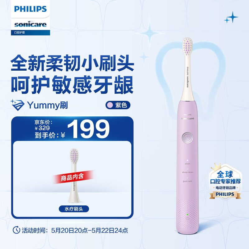 飞利浦(PHILIPS)电动牙刷S1成人 520情侣送男/女友 母亲节礼物 3种模式 全新柔韧SPA刷头HX2411/01 Yummy刷 紫色价格:199.00元!