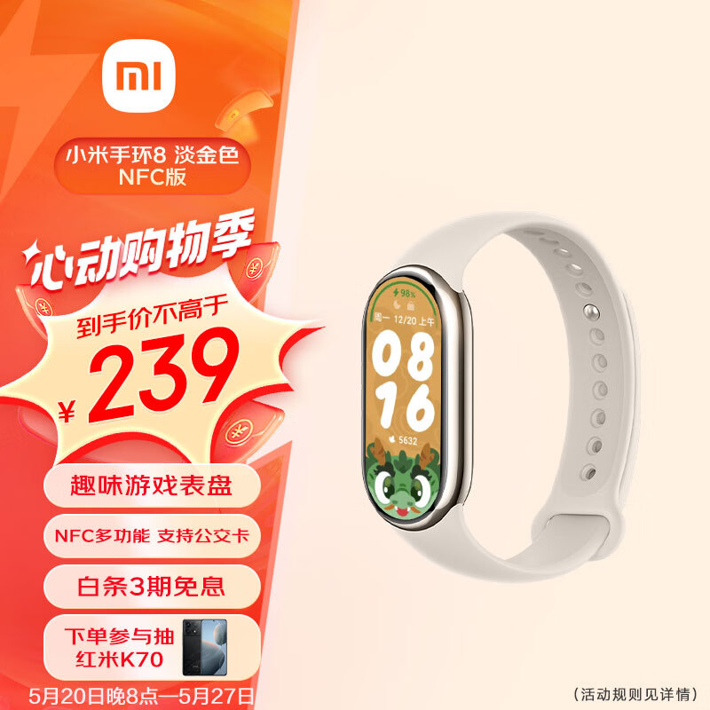 小米(MI)手环8 NFC版 150种运动模式 血氧心率睡眠监测 支持龙年表盘 电子门禁 智能手环 运动手环 淡金色价格:239.00元!