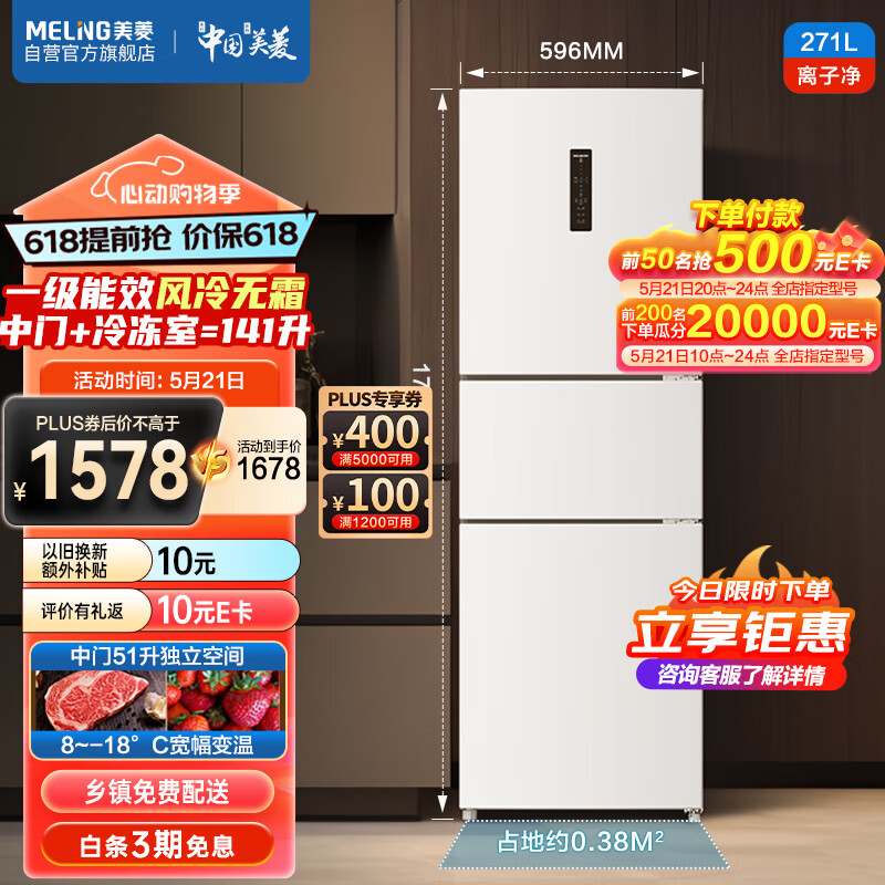 美菱(MeiLing)271升三门三开门冰箱家用变频一级能效节能省电风冷无霜低噪租房白色小冰箱BCD-271WP3CX以旧换新价格:1678.00元!