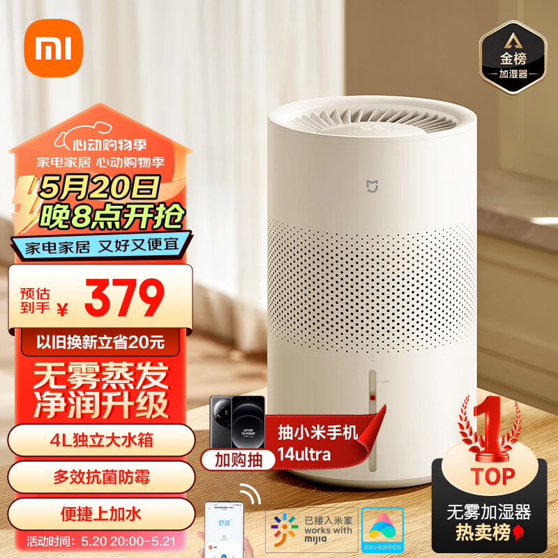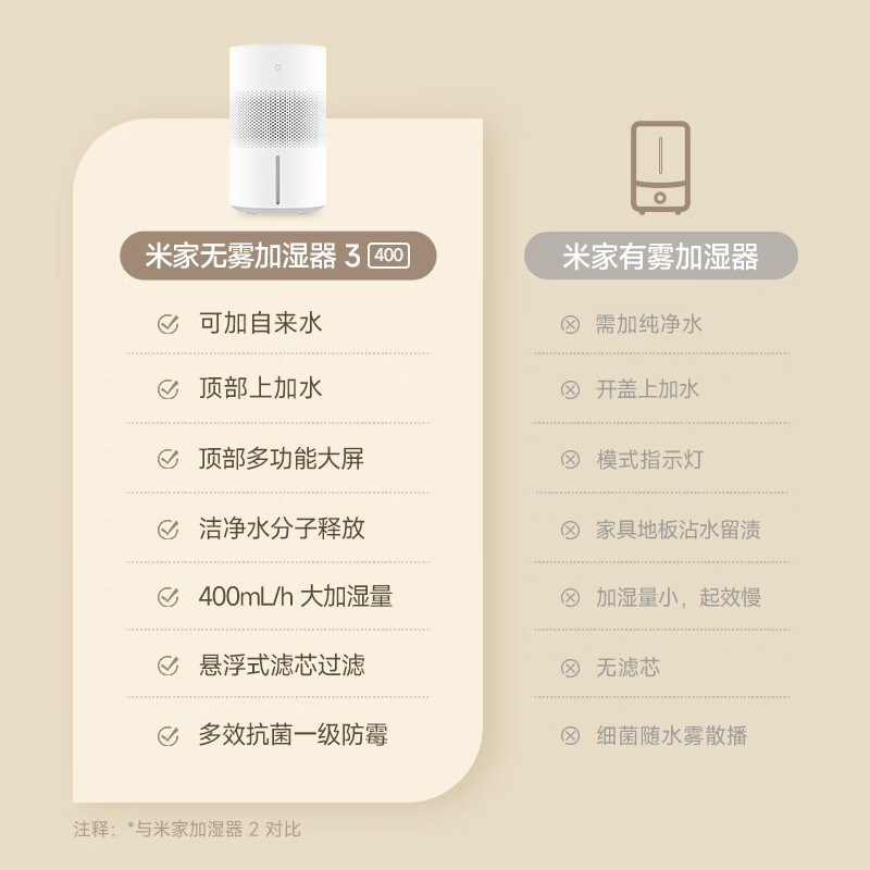米家小米无雾加湿器3(400) 卧室轻音家用办公室婴儿孕妇 400ml/h快速加湿空气 纯净式蒸发 4L大容量价格:379.00元!