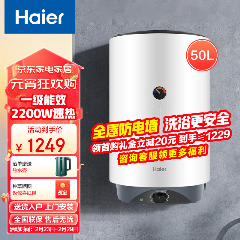 海尔(Haier)立式电热水器 50升家用竖式一级能效节能 2200W速热储水式即热恒温洗澡淋浴热水器ES50V-V1[家电]价格:1249.00元!