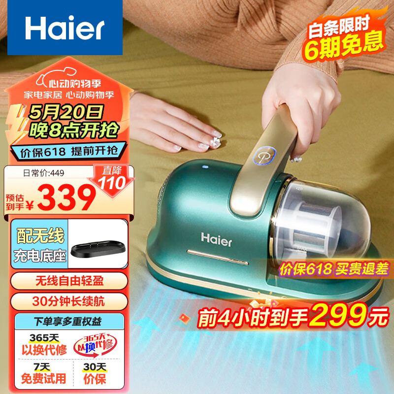 海尔(haier)无线除螨仪家用手持吸尘除螨器 大吸力床上拍打去螨虫机 UV-C紫外线除菌614GPRO配充电底座价格:339.00元!