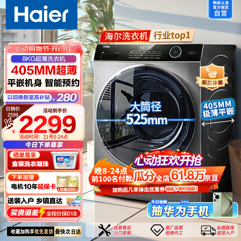 海尔(Haier)滚筒洗衣机8KG超薄家用全自动洗衣机 变频节能巴氏除菌香薰洗洗脱一体大筒径XQG80-B14126L价格:2299.00元!