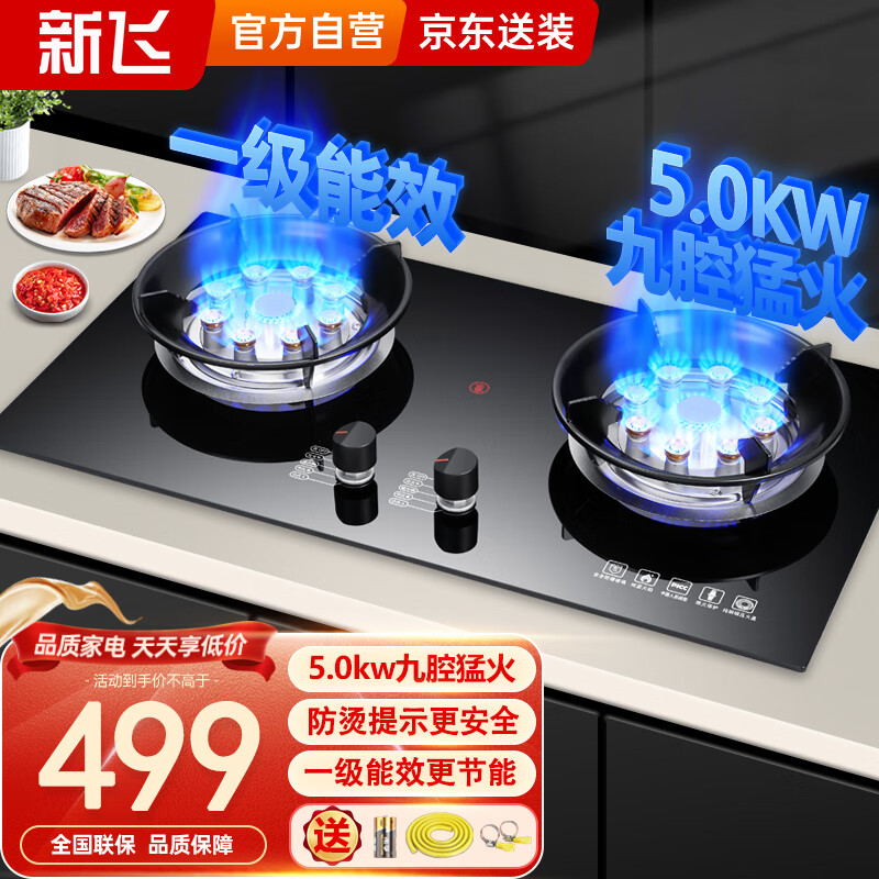 新飞家用燃气灶液化气双灶玻璃5.0KW一级能效嵌入式台式灶煤气灶聚能猛火双九腔纯铜炉具JZY-A3价格:449.00元!