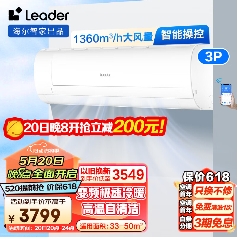 Leader空调海尔出品大3匹挂机 家用变频冷暖三级能效节能省电自清洁壁挂式空调 以旧换新 MDA83TU1[家电]价格:3999.00元!