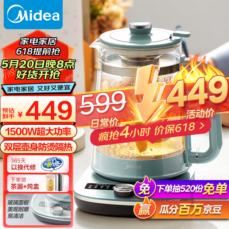 美的(Midea)轻净系列养生壶 煮茶器 316不锈钢煮茶壶恒温保温1500W双层防烫电热水壶 24H预约烧水壶MK-YS01-I价格:449.00元!