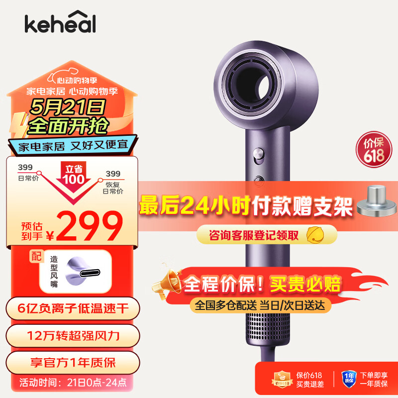 KEHEAL科西高速吹风机 家用静音负离子大风力大功率不伤发电吹风速干护发吹风筒礼物推荐 HC2星云紫价格:325.00元!