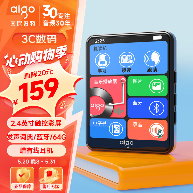 爱国者aigo 325-64G mp3/mp4播放器无损音乐随身听2.4英寸蓝牙外放发声词典电子书 学生听英语听力复读机价格:179.00元!