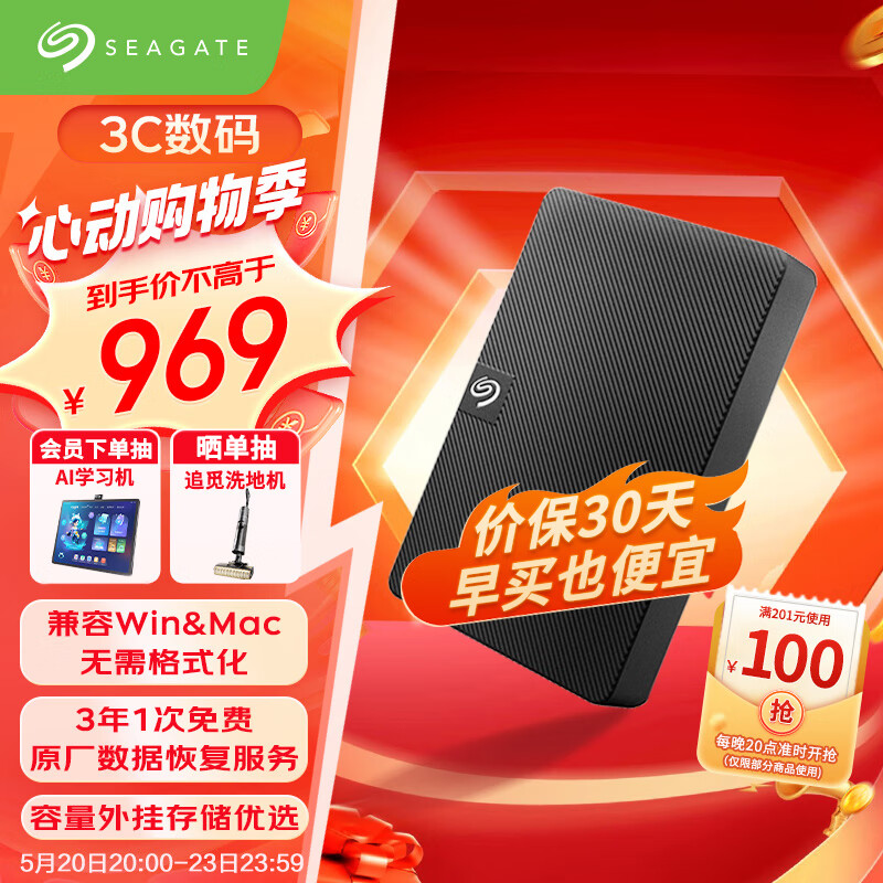 希捷(SEAGATE)移动硬盘 5TB USB3.0高速 希捷睿翼 2.5英寸 机械硬盘 便携 黑 兼容mac 外接存储 数据恢复服务价格:969.00元!