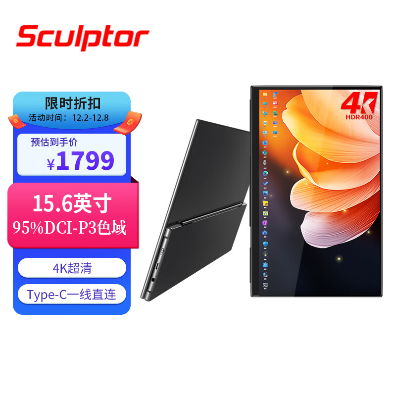 ??雕塑家15.6英寸便携显示器 4K显示器 触摸便携屏 type-c手机电脑副屏 笔记本Ps4/5游戏外接扩展移动拓展屏价格:1849.00元!