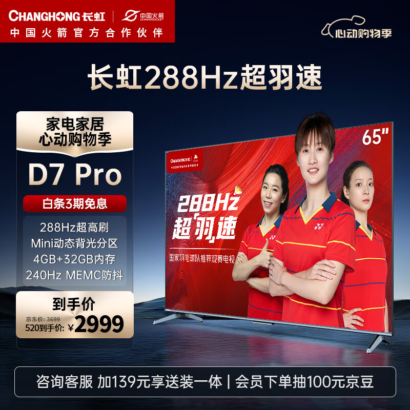 长虹电视65D7 PRO 65英寸288Hz游戏电视 Mini动态背光杜比音画 MEMC 4K智能平板液晶LED电视机以旧换新价格:3099.00元!