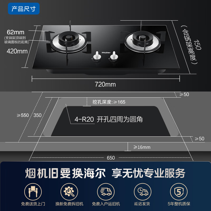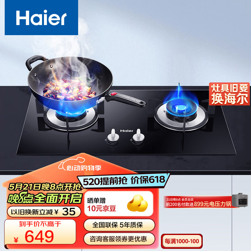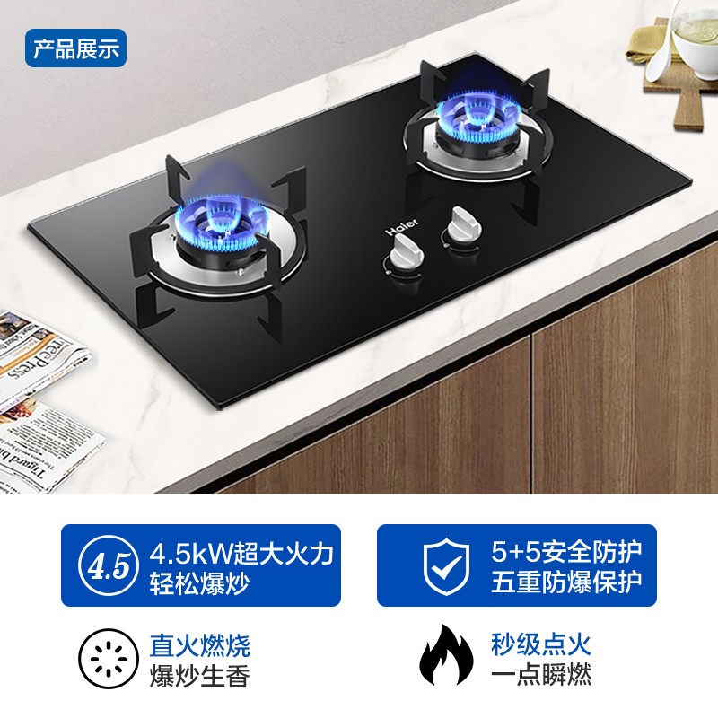 海尔(Haier)燃气灶4.5kW大火力嵌入式瞬燃点火家用全进风钢化玻璃双眼燃气灶 JZY-Q2BE2(液化气)价格:649.00元!