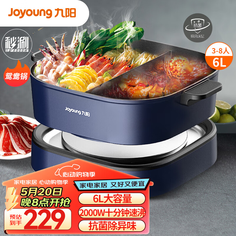 九阳(Joyoung)火锅专用锅电火锅火锅锅电炒锅电热锅不粘涮烤锅6L大容量2000W大火力超快家用鸳鸯锅 秒涮系列G595价格:229.00元!