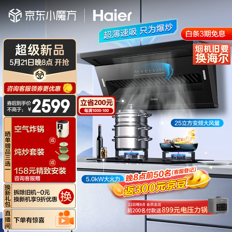 海尔(Haier)抽油烟机 顶侧双吸烟灶套装 变频25m3/min大吸力 5.0kw家用厨房吸油烟机燃气灶具套装C61+Q2BE2天价格:2799.00元!