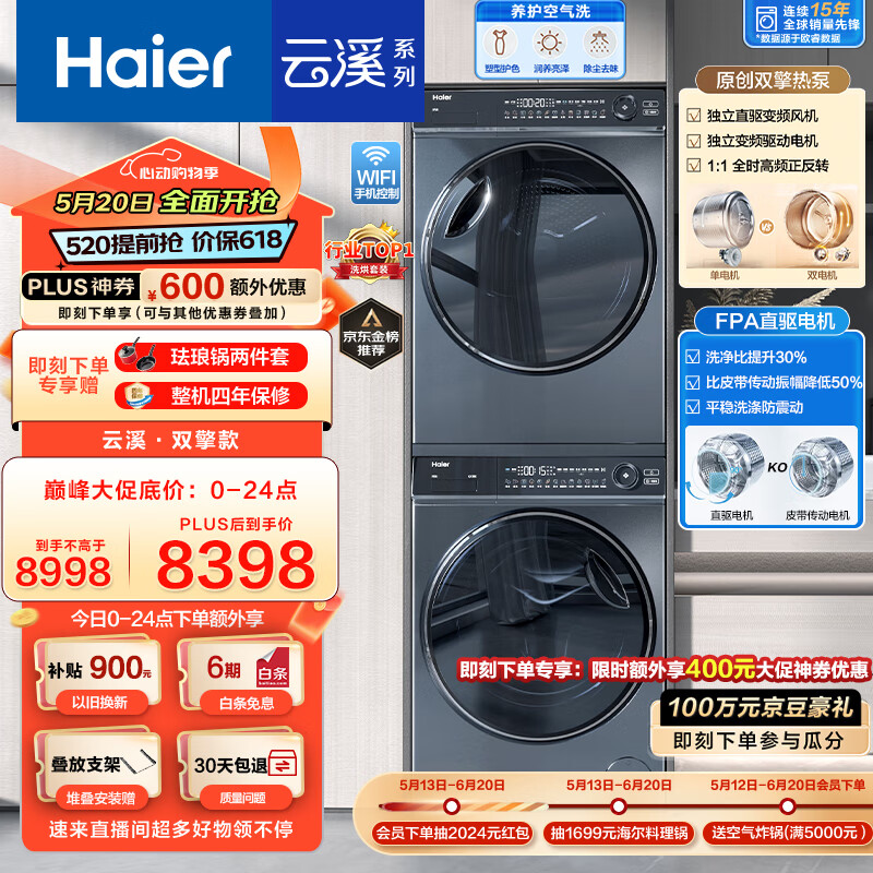 海尔(Haier)云溪376洗烘套装 10KG精华洗超薄滚筒洗衣机全自动+双擎热泵烘干机家用组合 376+376 以旧换新价格:8998.00元!