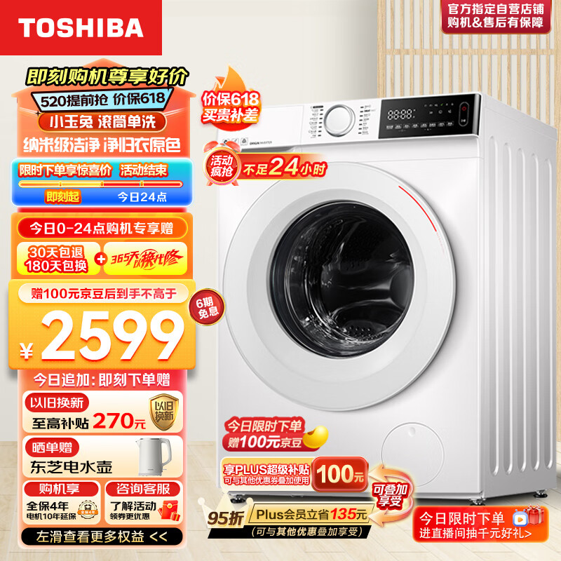 东芝(TOSHIBA)滚筒洗衣机全自动【小玉兔DG-10T13B】BLDC变频电机 10公斤大容量 UFB超微泡 以旧换新价格:2699.00元!