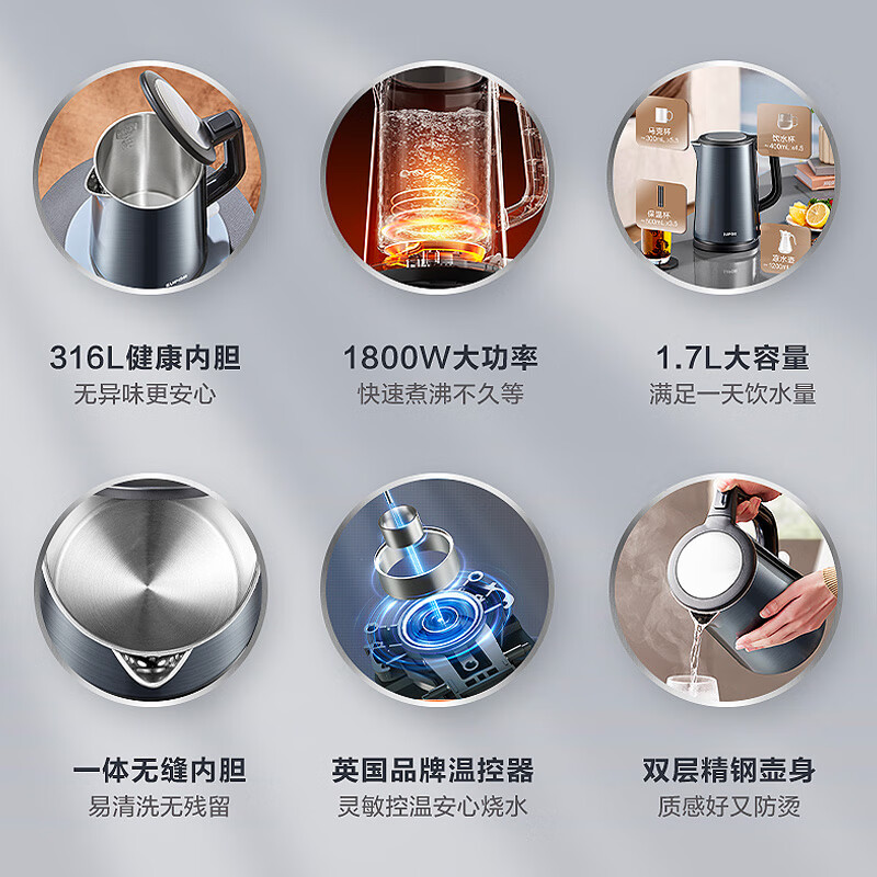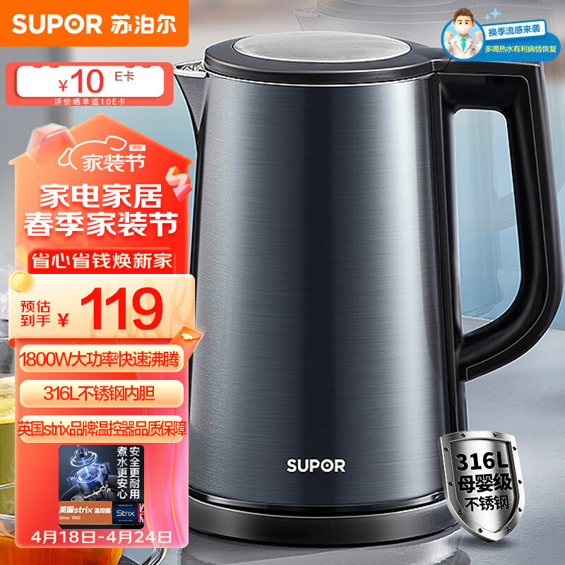 苏泊尔(SUPOR)电水壶热水壶 1.7L大容量全钢无缝双层防烫大功率电热水壶 316L不锈钢烧水壶 SW-17J17L价格:119.00元!