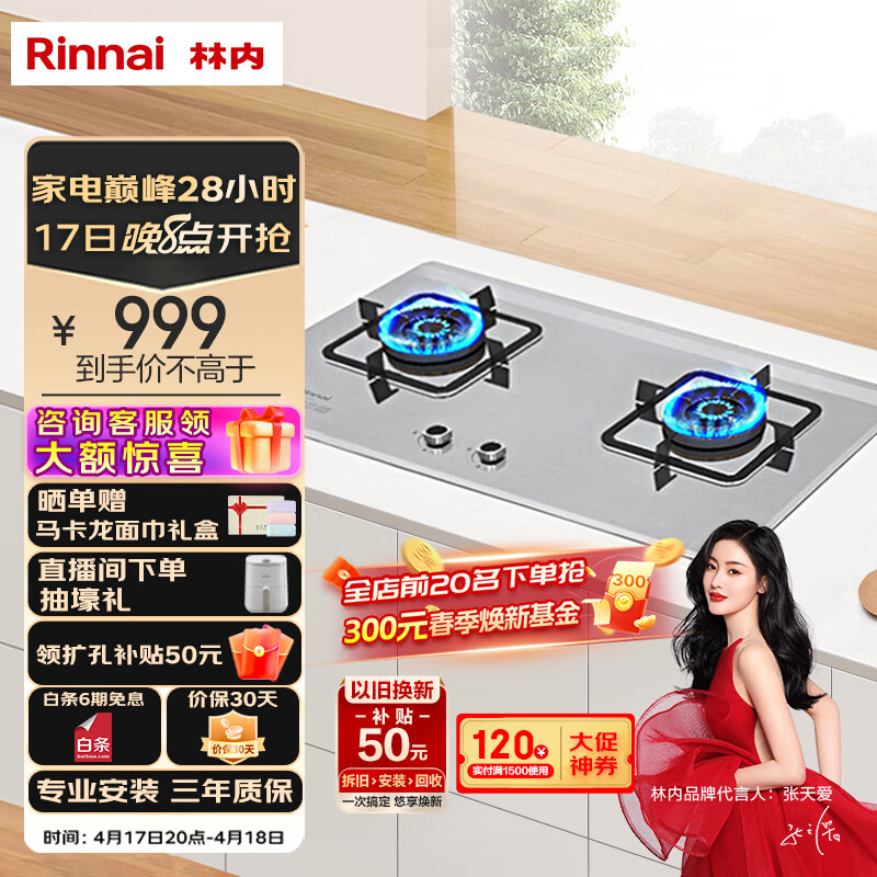 林内(Rinnai)燃气灶 天燃气灶双灶 嵌入式5KW超大火力猛火灶具 不锈钢面板 JZT-2E08M 天然气 一级能效价格:998.00元!