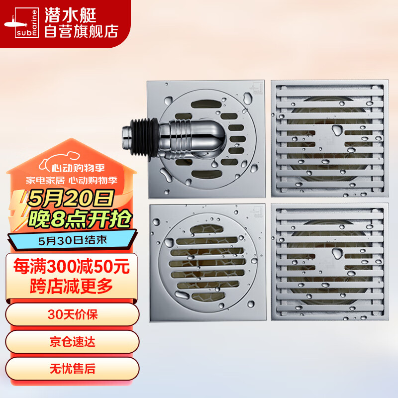 潜水艇(Submarine)黄铜镀铬防臭地漏套装 50管径 2个大排量淋浴+干湿区+洗衣机价格:383.00元!