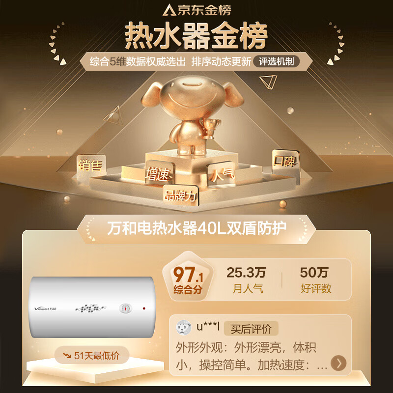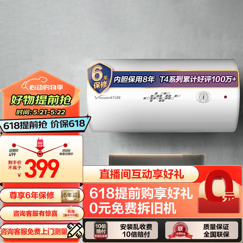 万和(Vanward)40升电热水器双防电盾 双重防护 温显型洗澡机E40-T4-22价格:398.00元!