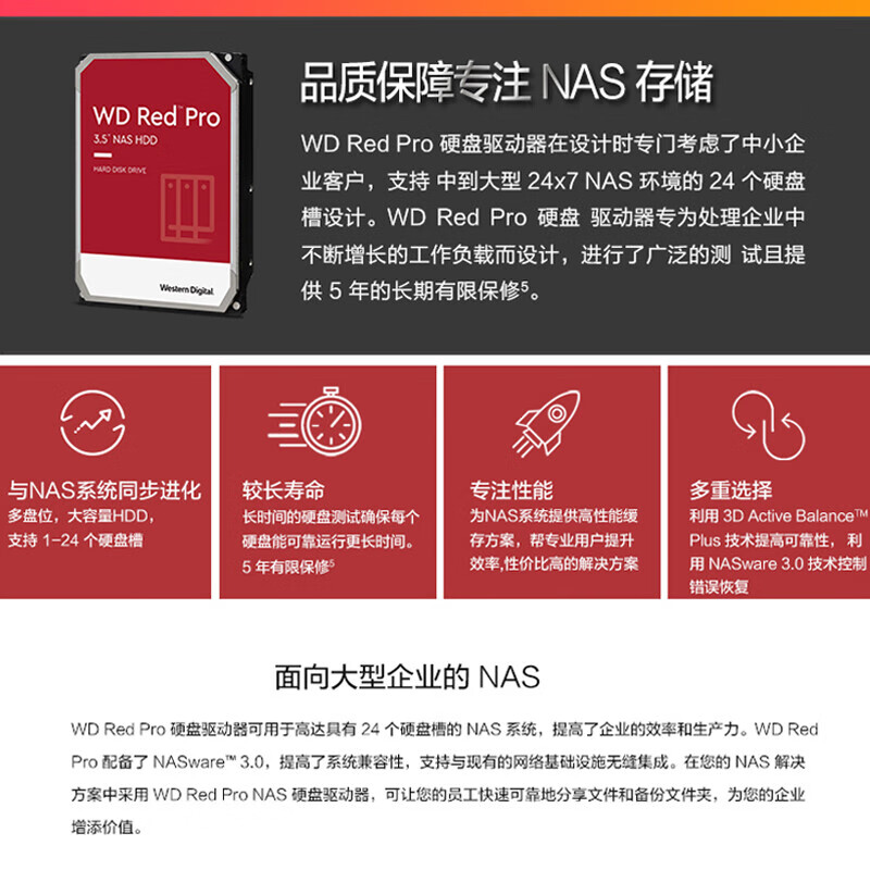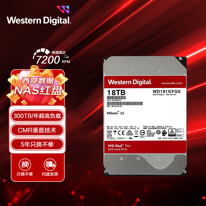 西部数据 NAS硬盘 WD Red Pro 西数红盘Pro 18TB CMR 7200转 512MB SATA 网络存储 私有云常备(WD181KFGX)价格:3899.00元!