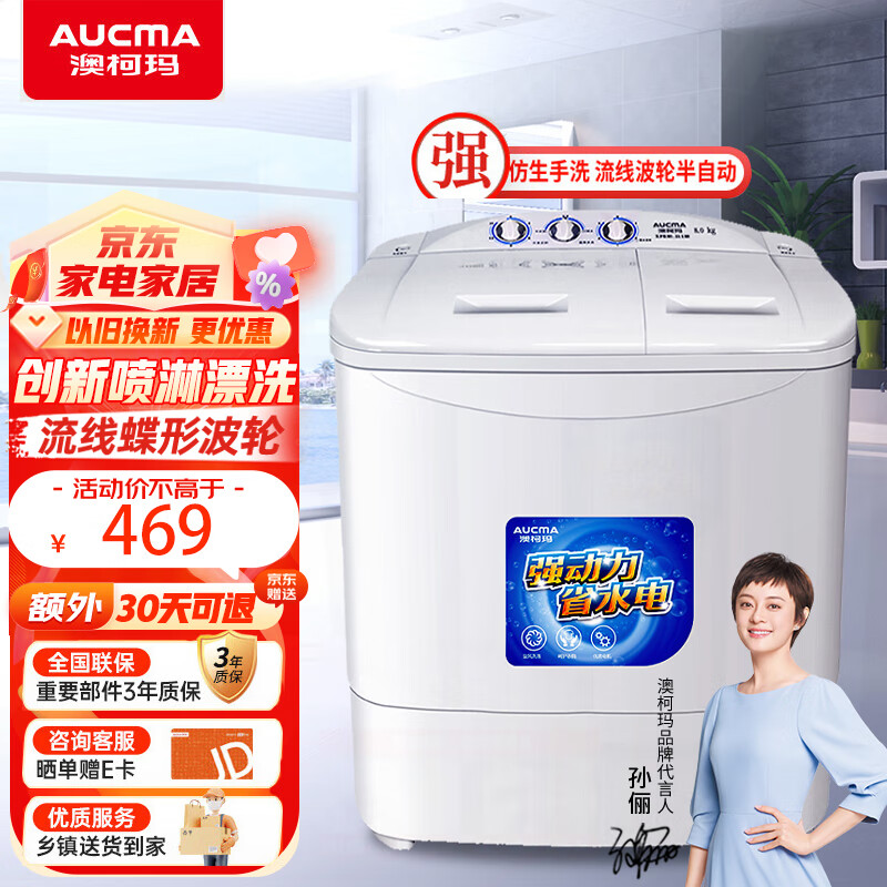 澳柯玛(AUCMA)洗衣机 8公斤半自动波轮洗衣机 大容量双缸双桶 洗脱分离 脱水甩干机 租房家用家电XPB80-2118S价格:469.00元!