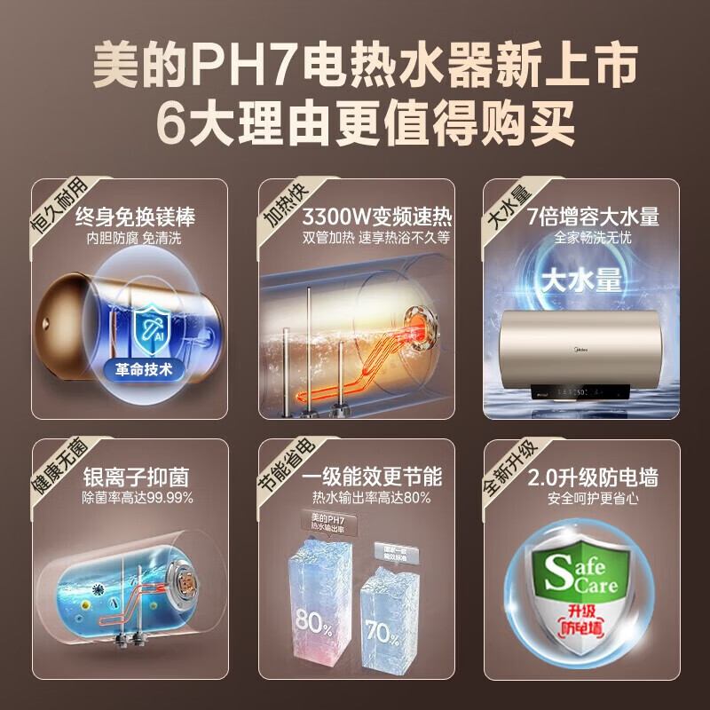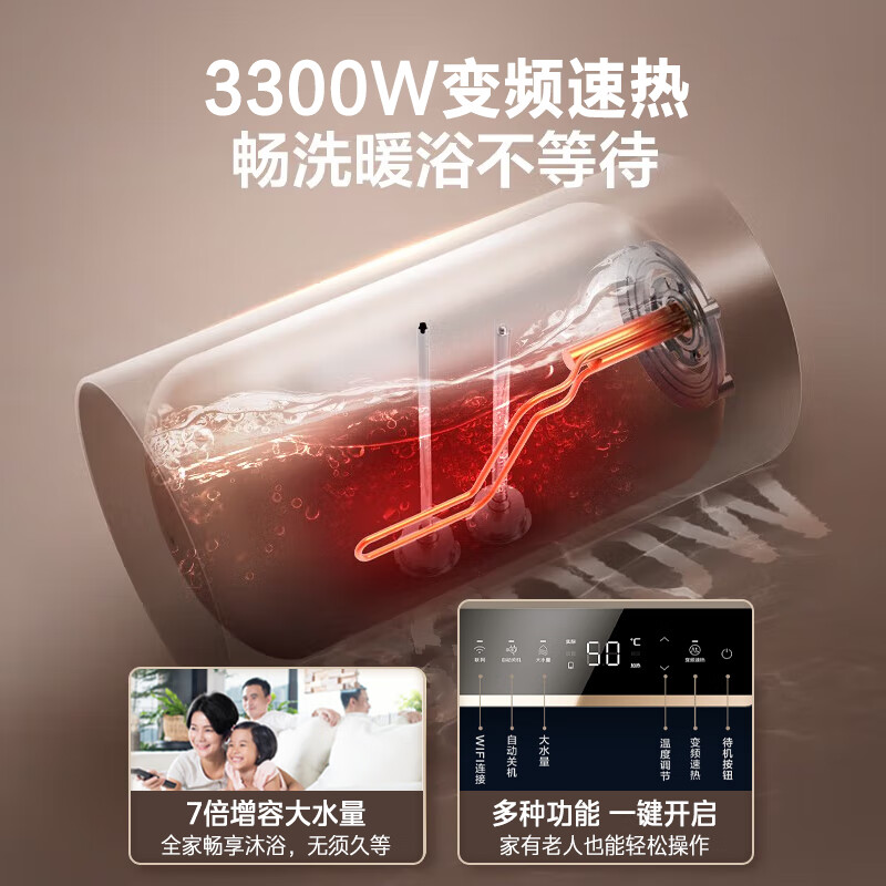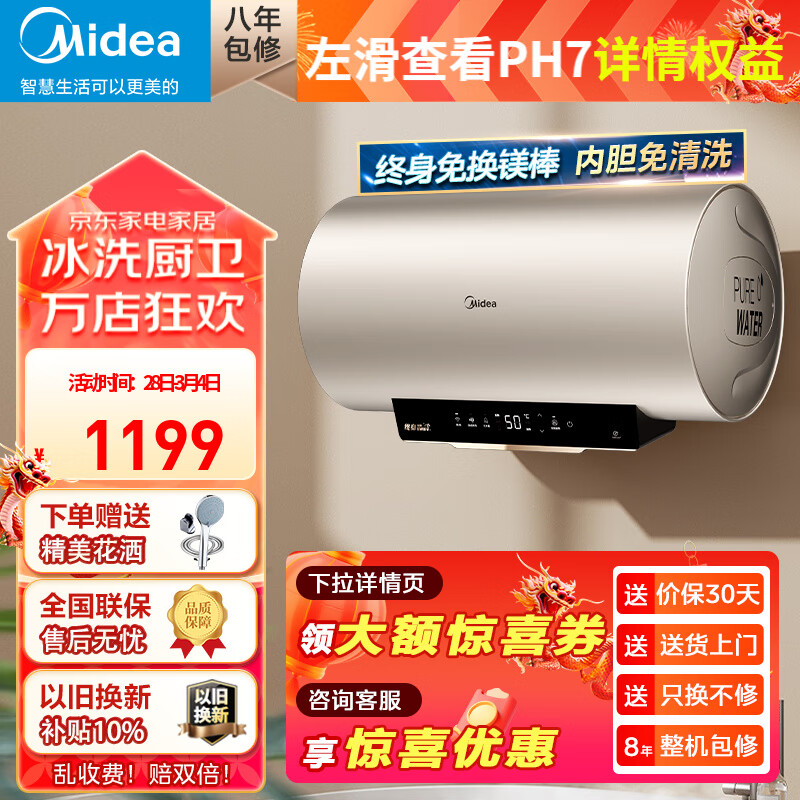 美的(Midea)电热水器60升 2300/3300w变频双管速热 免换镁棒健康免清洗家用大水量热水器 智能APP控制 60L 3300W 自动关机价格:1199.00元!