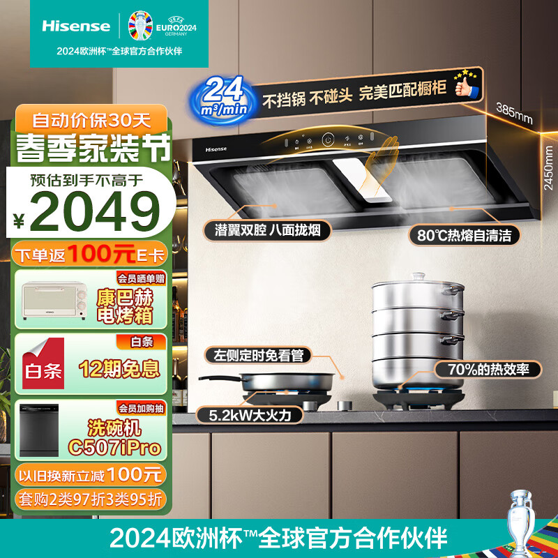 海信(Hisense)抽油烟机欧式双腔T字型家用烟机 24m3大吸力挥手智控WIFI 热熔自清洗烟灶套装T1+DB33以旧换新价格:2149.00元!