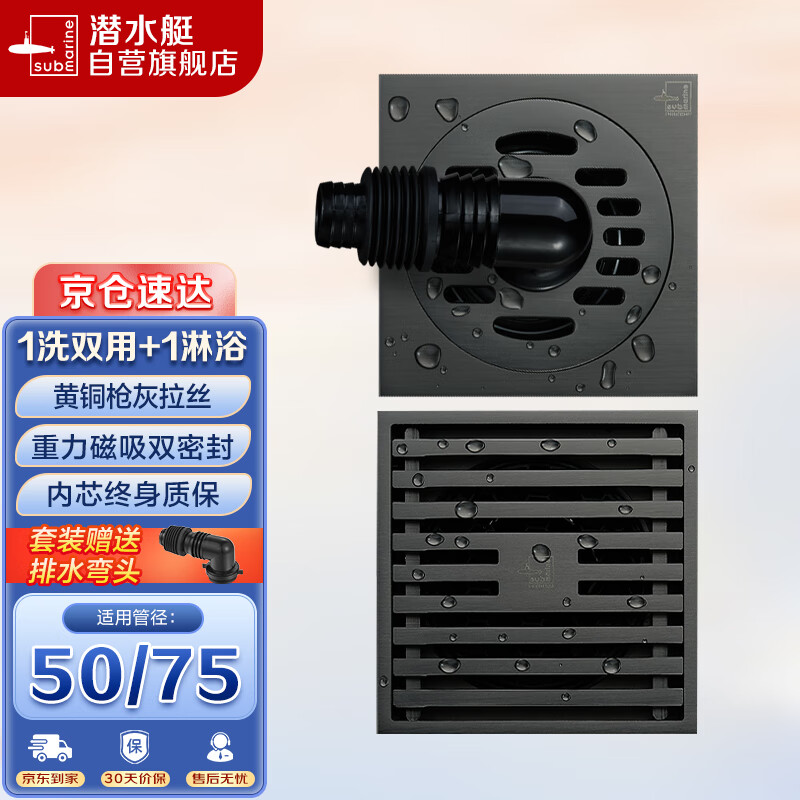 潜水艇(Submarine)黄铜镀镍枪灰色拉丝面50管防臭地漏套装 大排量淋浴+两用洗衣机价格:231.00元!