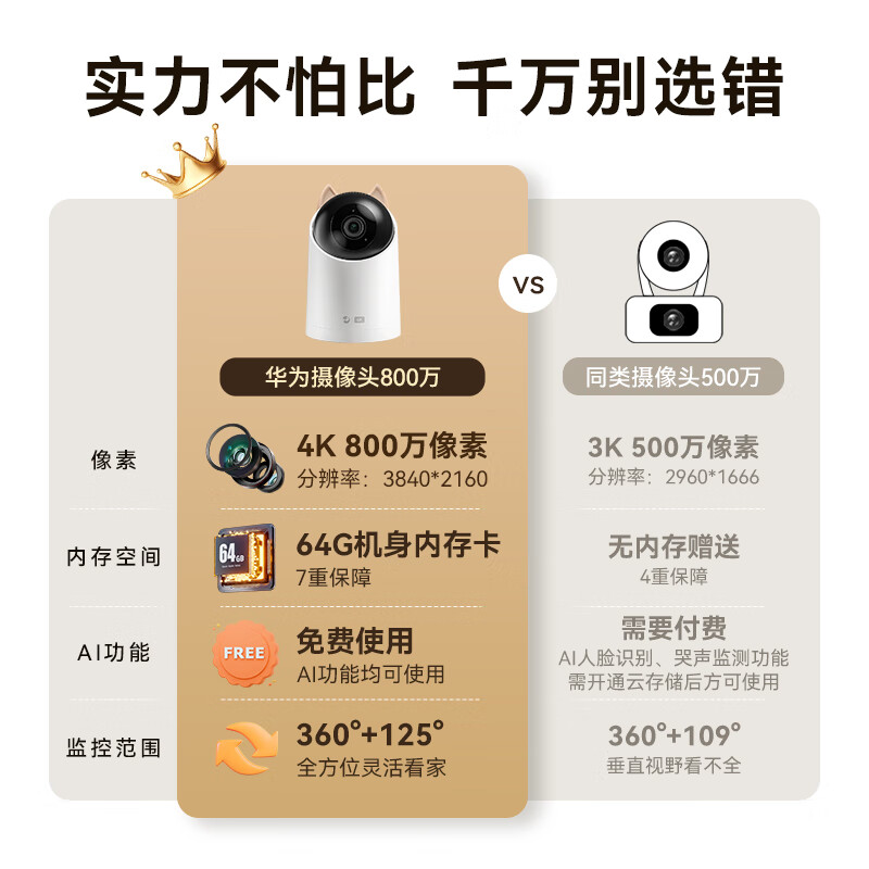 华为智选4K 800万摄像头家用监控手机远程监控器家用360度无死角带夜视全景语音通话高清家庭室内海雀云台价格:349.00元!