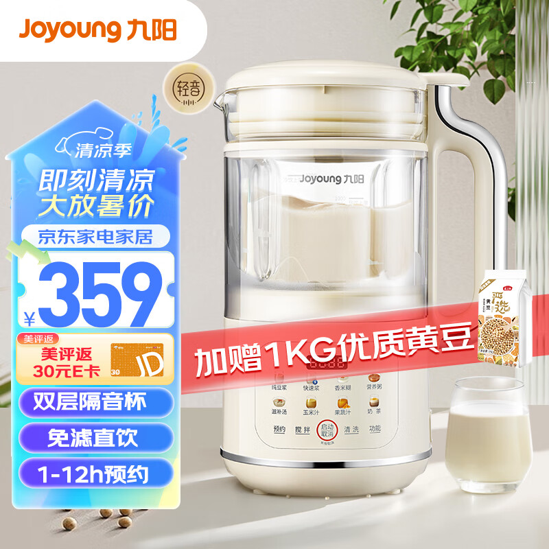 九阳破壁机1.2L家庭容量豆浆机 快速浆8大功能预约时间可做奶茶一键清洗料理机DJ12X-D360价格:359.00元!