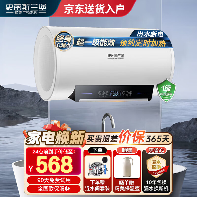 史密斯兰堡电热水器 家用40升L储水式2200W双重防护卫生间出租房速热洗澡淋浴机一级能效DSZF-T03Y40价格:568.00元!