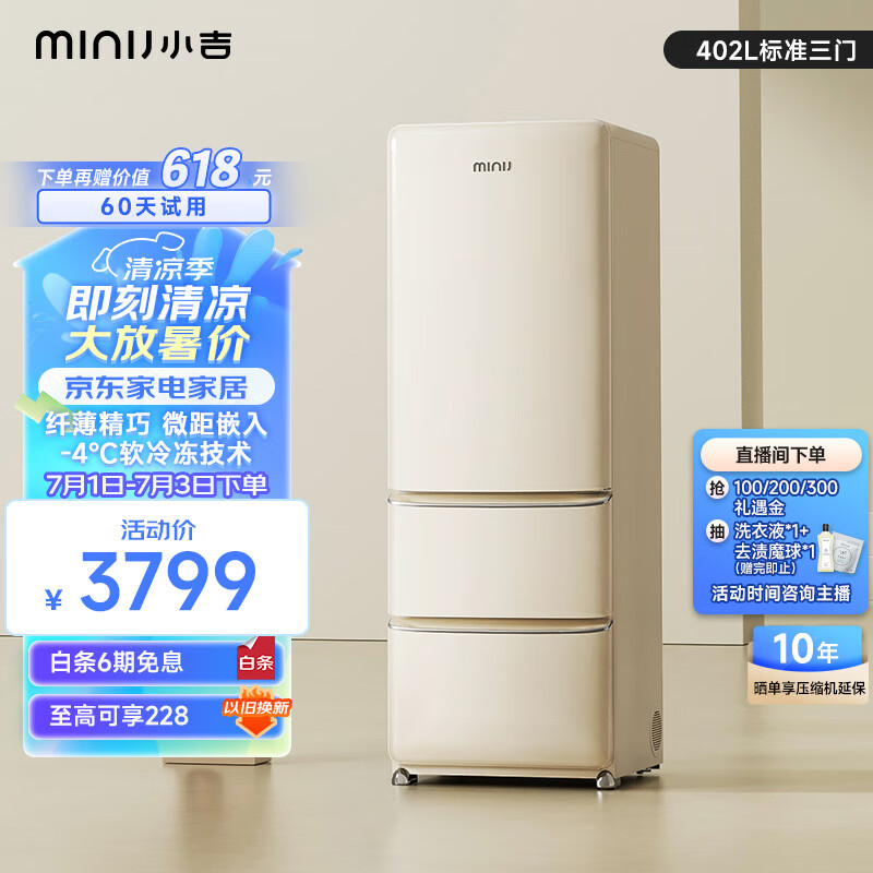 小吉(MINIJ)402L双变频风冷无霜低噪一级能效复古意式三门冰箱 -4度软冷冻技术 BCD-402WS经典奶酪白价格:3799.00元!
