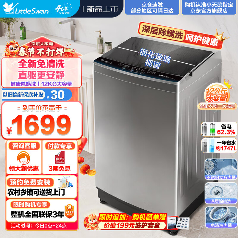 小天鹅(LittleSwan)波轮洗衣机全自动 12公斤大容量变频电机免清洗不脏桶深层除螨洗 钢化玻璃门盖智能预约 以旧换新 12公斤变频波轮价格:1699.00元!