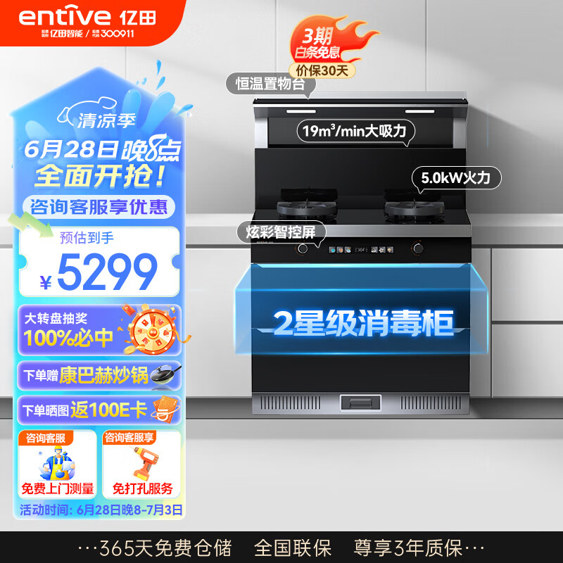 亿田(entive)JJZY-TC3X-A集成灶消毒柜 一体灶家用 油烟机燃气灶二星消毒柜一体灶套装家用 右排烟 液化气价格:5299.00元!