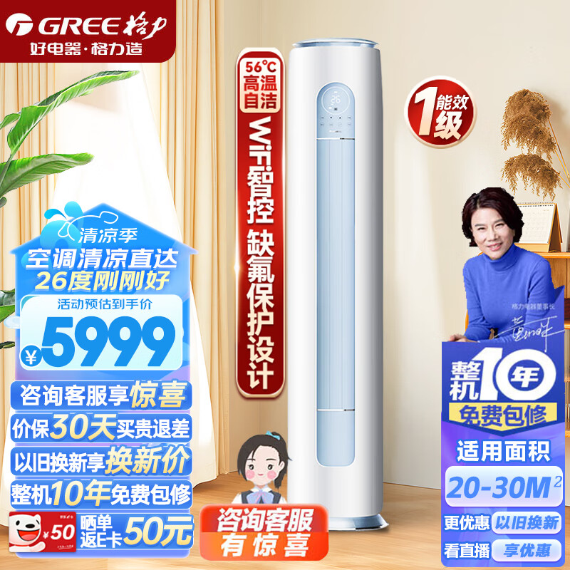 格力(GREE)空调立式 云逸-Ⅱ变频冷暖自清洁智能WiFi大风量圆柱2匹一级能效空调柜机KFR-50LW/NhGm1BAj价格:5999.00元!