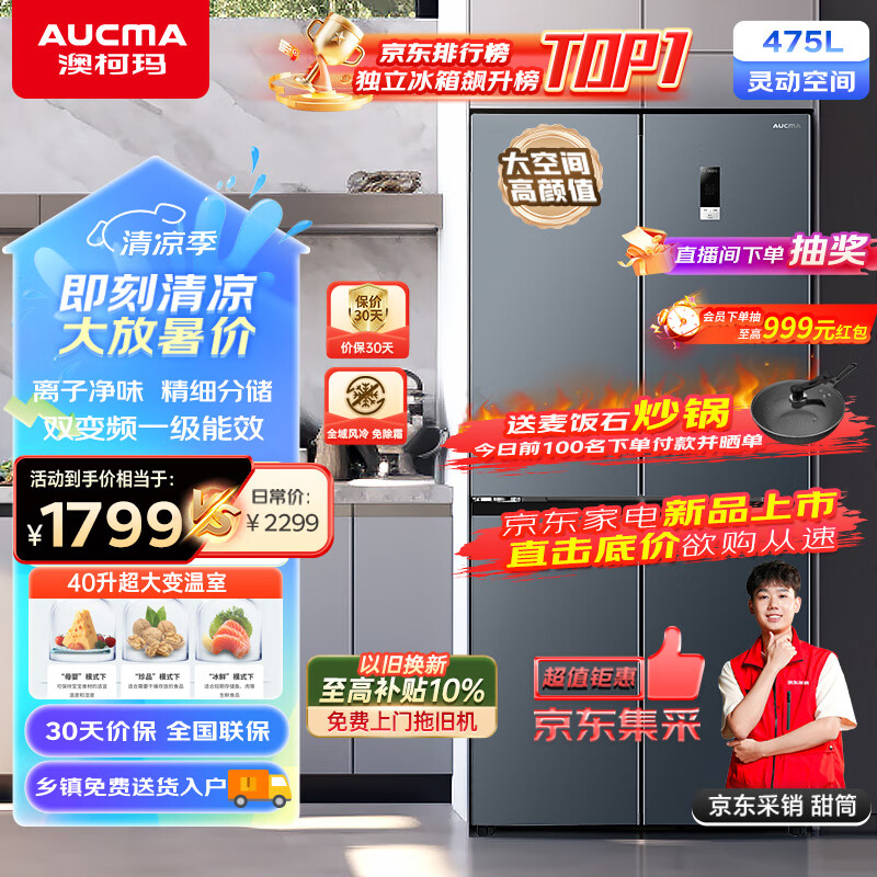 澳柯玛(AUCMA)475升十字双开四开多门风冷无霜家用大容量一级能效双变频超薄电冰箱 以旧换新BCD-475WPHXFE价格:2999.00元!