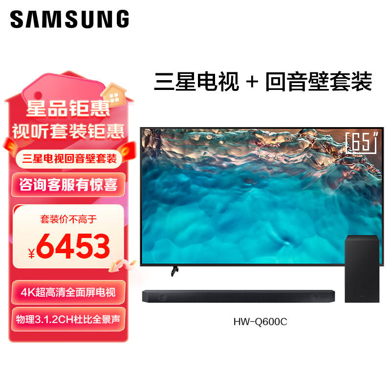 三星(SAMSUNG)65英寸电视+Q600C 回音壁 4K超高清HDR超薄屏 杜比全景声 DTS:X 家庭影院价格:6453.00元!