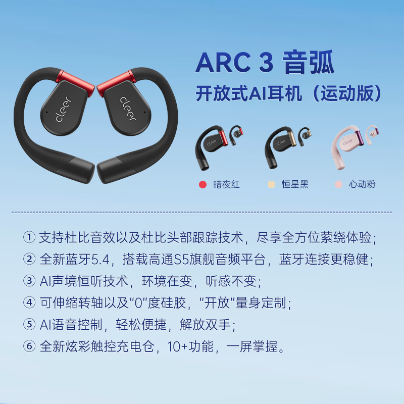 cleer【郎朗推荐】ARC 3 代 不入耳开放式杜比空间音频AI智能无线蓝牙耳机挂耳式骨传导升级 暗夜红价格:1399.00元!
